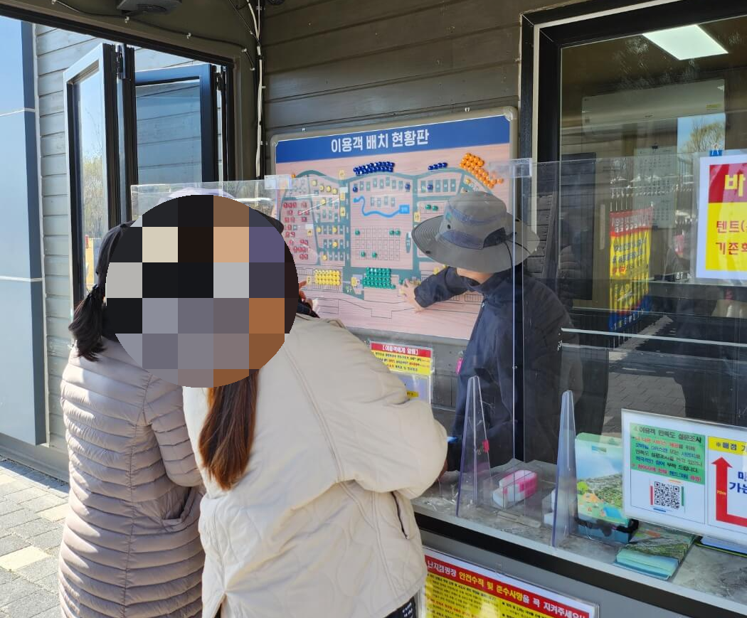 왜 뜬금없이 부지런함이냐고 갸우뚱하고 계시죠? 정말 필수입니다. 왜냐? 모든 캠핑장의 위치는 선착순으로 선택할 수 있기 때문입니다. 아래 사진을 보시면 줄을 선 뒤, 입장하면서 통과하는 관리소 입구에서 캠핑 사이트 위치를 고르고 있는 모습입니다. 저와 같은 경우, 일요일에 방문했었습니다. 한 시간이 좀 전에 도착했는데, 이미 10여 팀이 안되게 이미 줄을 섰더라고요. 명당을 위해서는 이 정도의 부지런함은 필수 같습니다. 명당 필요 없다, 그냥 대충 캠핑하겠다! 하시는 분들은 여유롭게 오셔도 되겠습니다.